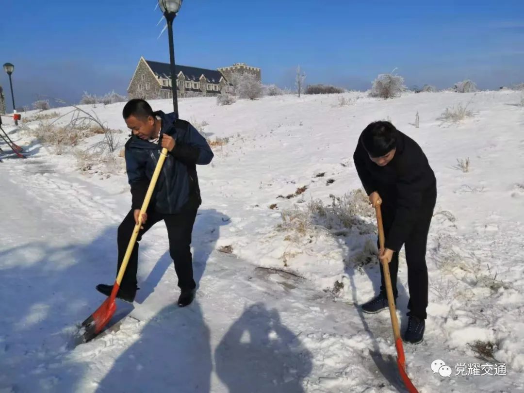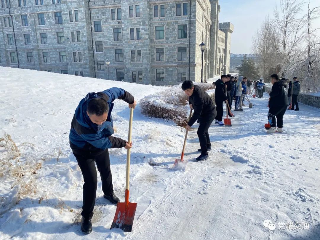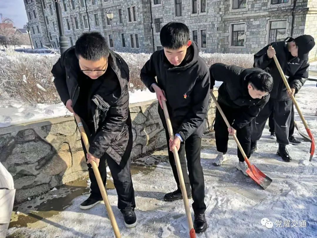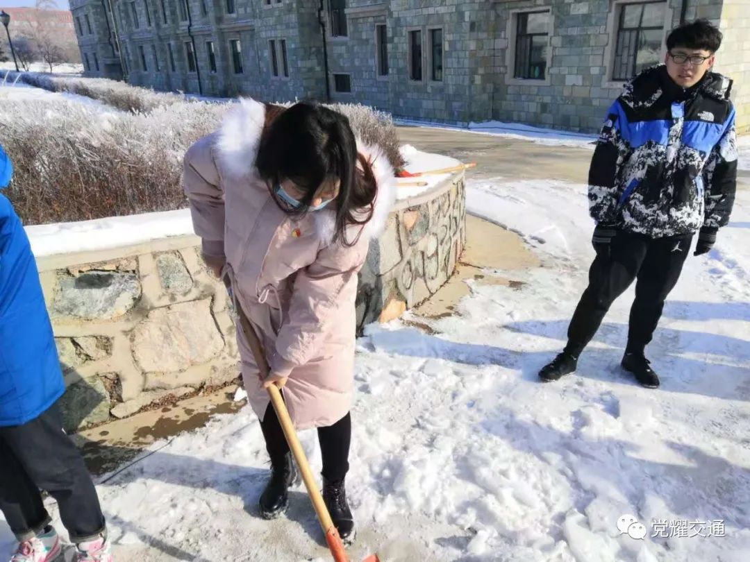 午后明媚的阳光照耀着党员积极分子以及学生干部劳动的背影,就犹如中国共产党的坚定信念和伟大的思想在照耀着我们一般。全体同学们,积极主动,认真仔细地拿着工具清理积雪和冰块。