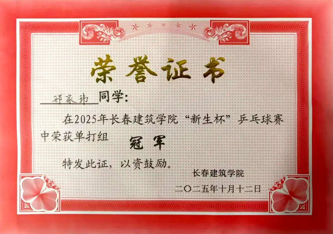 交通学院乒乓球团队成员邢家玮同学在比赛中成功斩获2025年长春建筑学院“新生杯”乒乓球赛单打组冠军。