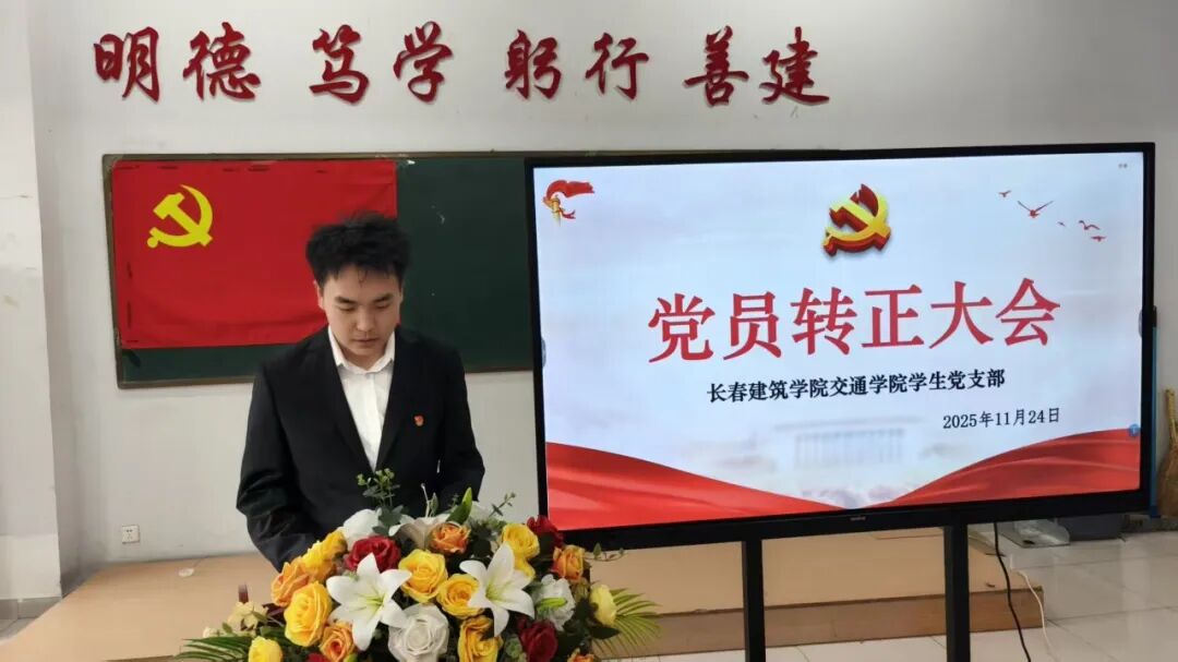 交通学院党总支副书记马琰强调,发展党员工作与预备党员转正工作,均是贯彻党的组织原则和路线的重要体现,是党组织建设中极为严肃而关键的环节。在发展党员过程中,入党积极分子经培养教育、考察考验,逐步向党组织靠拢;预备党员在预备期间,通过持续学习与实践提升自身素质,接受党组织全方位考察。各位同志,这是你们政治生命的重要起点。希望你们牢记入党时的庄严承诺,始终以党员标准严格约束自身言行,持续提升思想觉悟,在学习和工作中充分发挥先锋模范作用,以实际行动践行全心全意为人民服务的宗旨,为党和人民的事业奋斗终身。