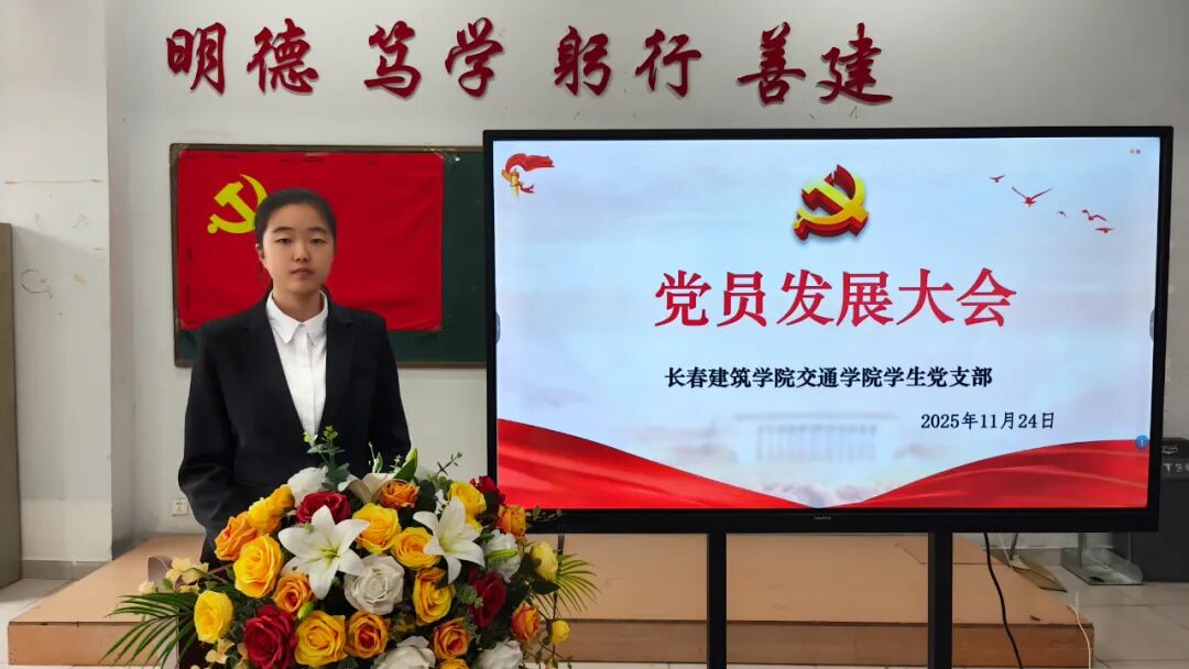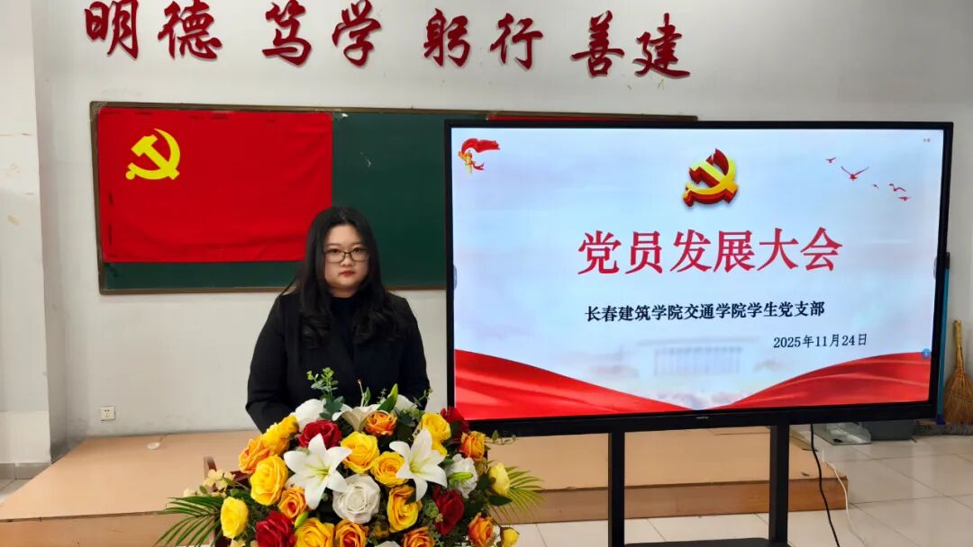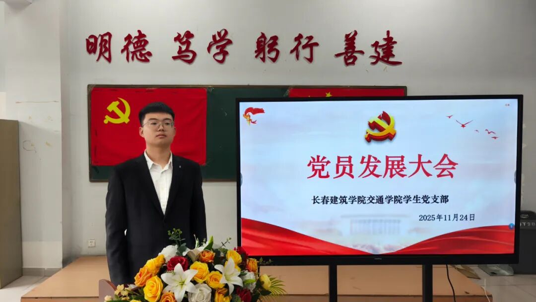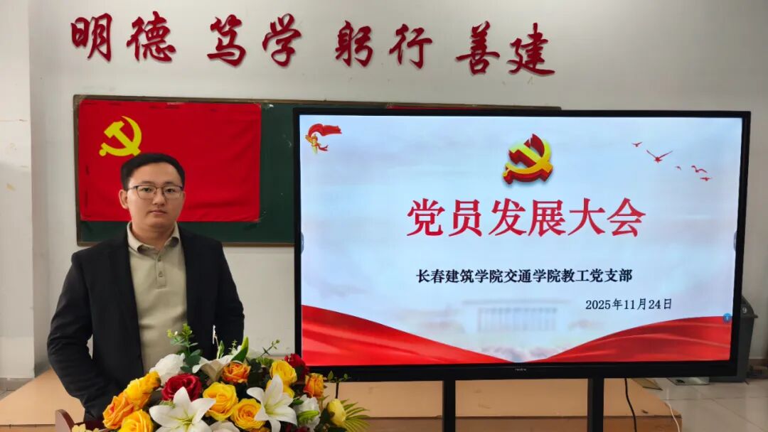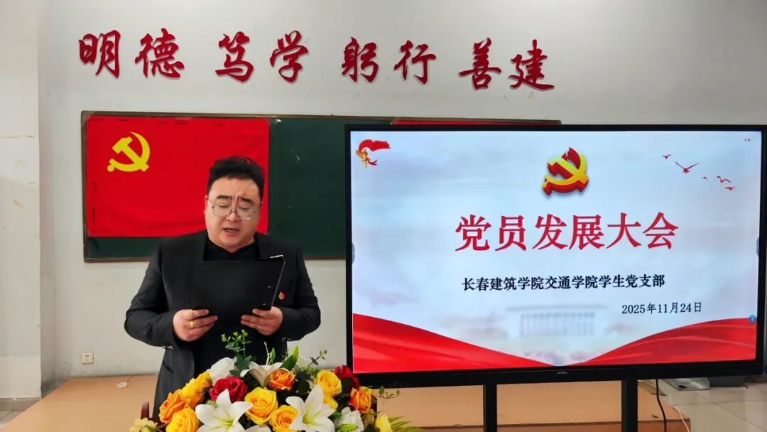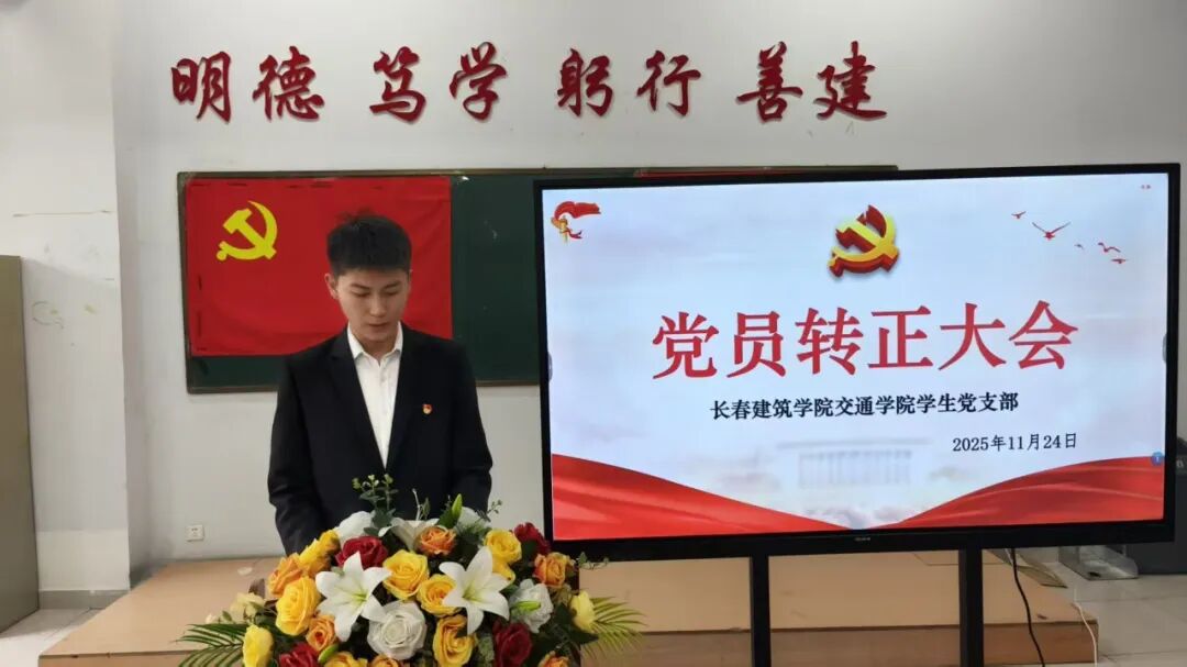 2025年11月24日,长春建筑学院交通学院在党团活动室召开党员发展暨转正大会,主要审议、讨论并表决发展马金峰、宋锦阳、孙琳皓、许皓杰、吴焱博、陈泓硕、苗壮、贾紫琪、甄子轩九名同志为中共预备党员以及预备党员李明阳、赵守奇、徐启博三名同志转为中共正式党员事宜。参与本次大会的有:交通学院党总支副书记马琰、教工支部书记李国栋以及全体党员。本次会议由交通学院学生支部书记郭梓睿主持。会议伊始,郭梓睿报告:长春建筑学院交通学院党总支共有党员27人,应到会正式党员18人,实到会正式党员18人,到会有表决权的正式党员超过一半,符合组织规定,可以开会。