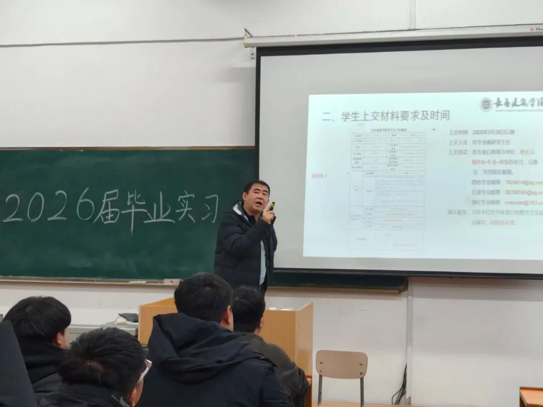 为进一步推进我校2026届毕业生实习工作,引导学生做好实习活动前的准备工作,增强学生对实习岗位的理解与认识,确保岗位实习工作的顺利有序开展。2025年12月22日15:00,长春建筑学院交通学院于报告厅召开2026届毕业实习动员会。本次会议由交通学院副院长李国栋主持,2026届相关毕业生参与会议。