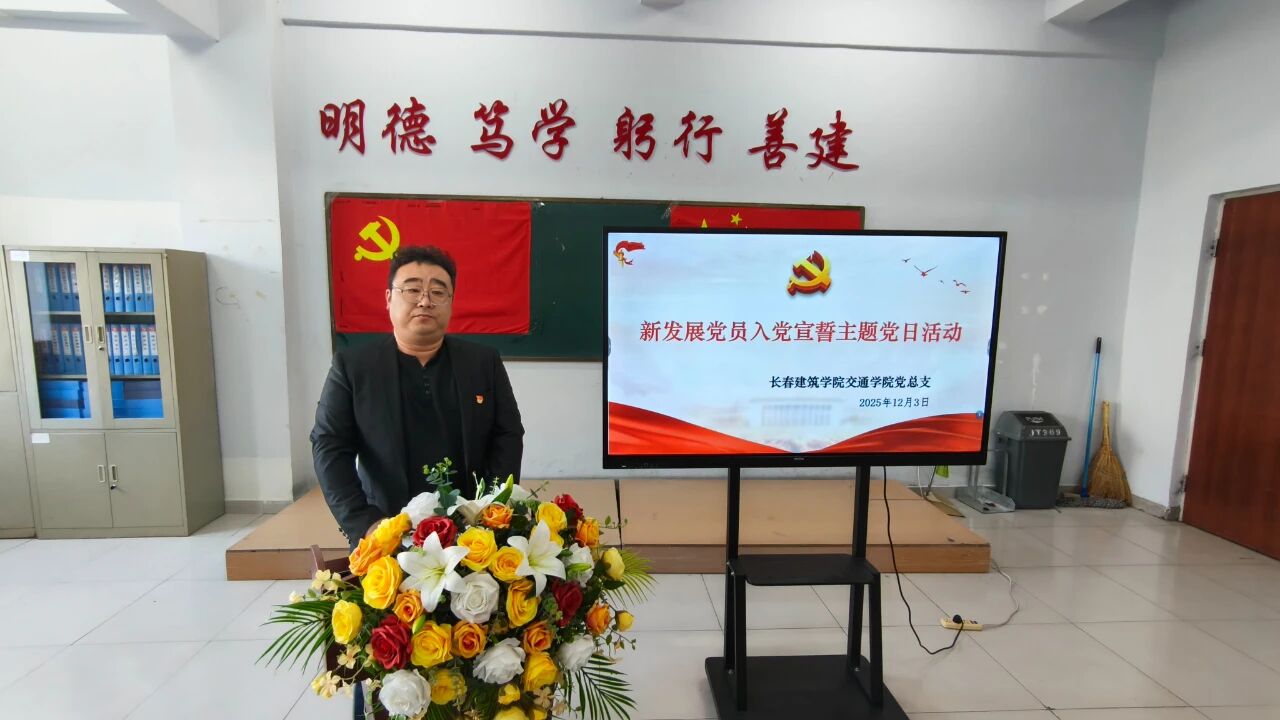 2025年12月3日,长春建筑学院交通学院在党团活动室召开新发展党员入党宣誓主题党日活动。参与此次活动的有:交通学院党总支副书记马琰、学生支部书记郭梓睿、党总支组织员李俊达以及全体新发展党员。本次活动由学生支部书记郭梓睿主持。